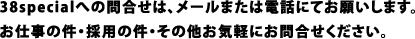 メールでの問い合わせ先は以下のアドレスへお願いします。 仕事に関する問合せ info@38sp.co.jp ホームページに関する問合せ webmaster@38sp.co.jp 採用に関する問合せ info@38sp.co.jp |