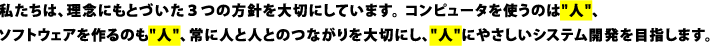 キーになるのは常に”人”と考えます。個性を尊重し、常に自分の意見を言える環境を作っていきます。お互いが認め合い、相手のいいところを積極的かつ柔軟に取り入れ、自主性と創造性に優れた”人”の集まりを目指します。