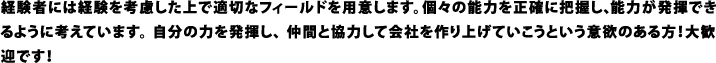 成長していくことができると考えています。 未経験で一人前の技術者になれるか不安があると感じている方、好きであれば絶対に大丈夫です! |